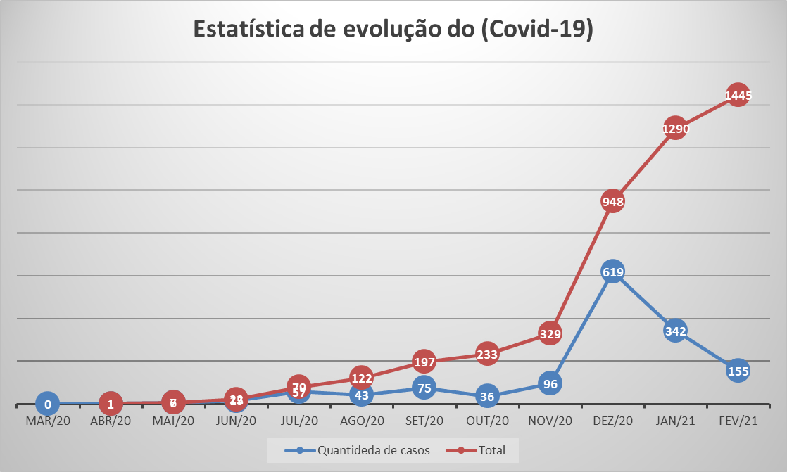 Apesar do expressivo aumento de casos nesta semana, a média de novos casos neste ano de 2021 está reduzindo de forma significativa mês a mês. A estatística diária do 1° ao 23º dia deste mês de fevereiro é de 6,73 – menos da metade dos últimos três dias. São 108 novos casos neste mês. Município totaliza 1.445 casos desde o início da pandemia.