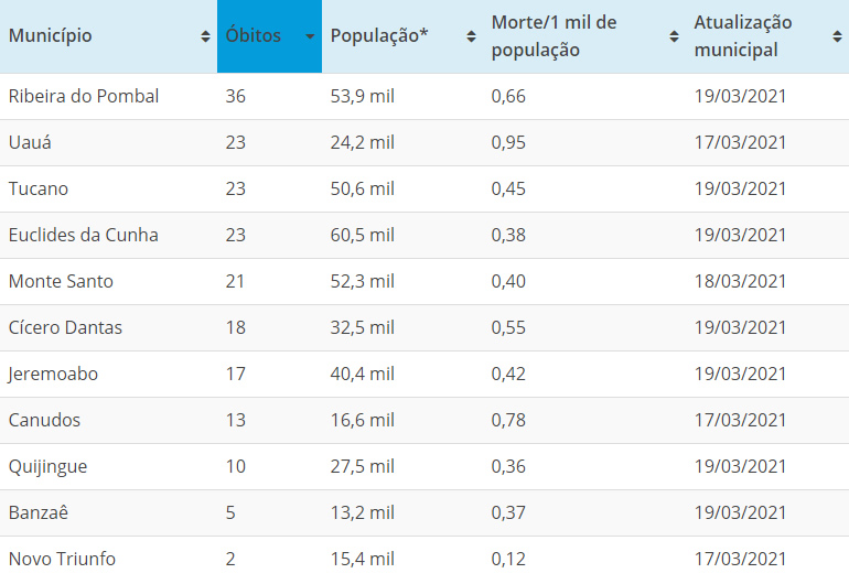 Em números relativos, Uauá tem a maior da letalidade pelo novo coronavírus: 0,95 por 1 mil de população. Os dados dos demais municípios analisados são: Canudos (0,78), Ribeira do Pombal (0,66), Cícero Dantas (0,55), Tucano (0,45), Jeremoabo (0,42), Monte Santo (0,40), Euclides da Cunha (0,38), Banzaê (0,37), Quijingue (0,36) e Novo Triunfo (0,12).