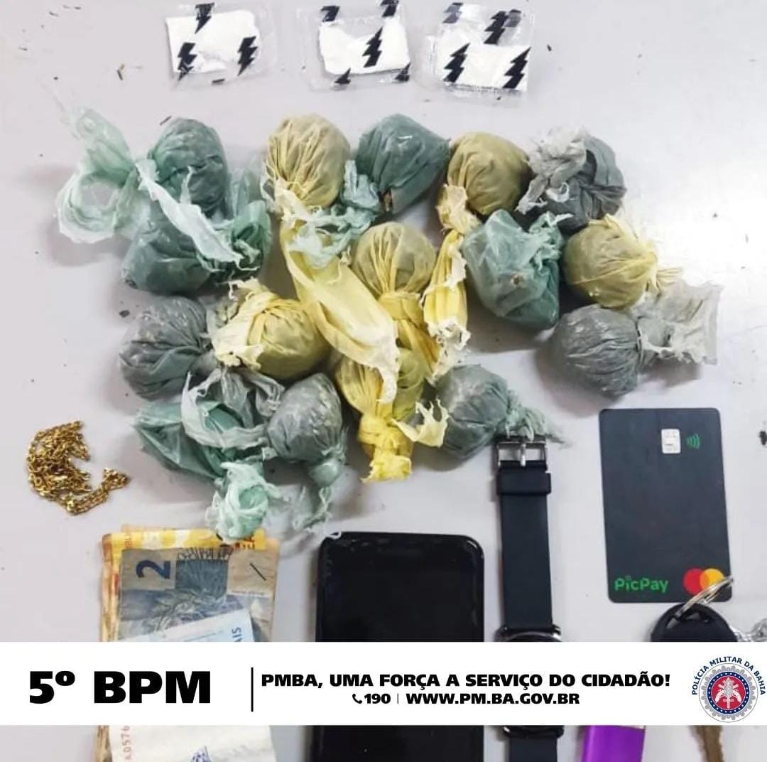 No momento da abordagem, a mulher foi detida com 16 invólucros contendo substância semelhante à maconha e 4 papelotes contendo substância semelhante à cocaína. Além disso, foram apreendidos itens como dinheiro em espécie no valor de R$166, um relógio, um aplicativo de pagamento digital (PicPay), uma corrente, um isqueiro, uma chave de carro e um celular Samsung.