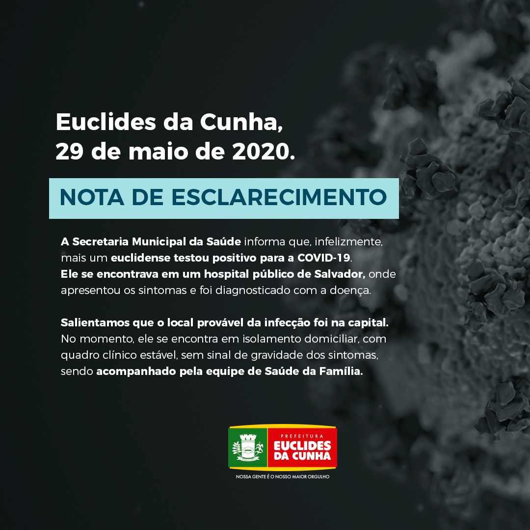 Na noite dessa sexta-feira, 29 de maio, o portal de notícias Euclidesdacunha.com recebeu a informação de que havia sido confirmado que mais uma pessoa de naturalidade euclidense testou positivo ao coronavírus.