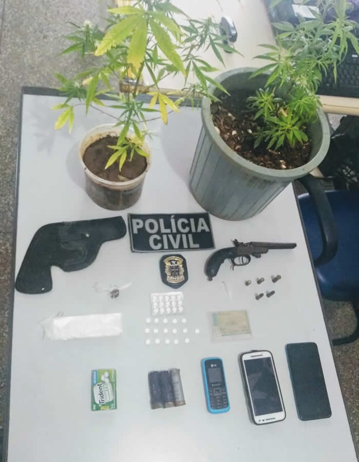 A Polícia Civil de Euclides da Cunha e integrantes do Departamento de Perícia Técnica (DPT) apreenderam nesta quinta-feira (06) uma arma de fogo do tipo garrucha calibre 32 de dois canos, munições intactas e deflagradas de mais de um tipo de arma, embalagens plásticas (saquinhos), usualmente utilizadas para confecção e individualização de porções de drogas, 31 comprimidos de arrebite, um, tubo/pino de Eppendorf, usualmente utilizado para acondicionar cocaína, determinada quantia de droga e dois