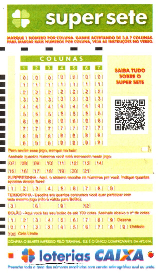 De acordo com a CEF, o Super Sete é a loteria de prognósticos numéricos cujo volante contém 7 colunas com 10 números (de 0 a 9) em cada uma, de forma que o apostador deverá escolher um número por coluna. Caso opte por fazer apostas múltiplas, poderá escolher até mais 14 números (totalizando 21 números no máximo), sendo no mínimo 1 e no máximo 2 números por coluna com 8 a 14 números marcados e no mínimo 2 e no máximo 3 números por coluna com 15 a 21 números marcados. São sorteados sete números (um por coluna). Você pode deixar, ainda, que o sistema escolha os números para você (Surpresinha) e/ou continuar com o seu jogo por 3, 6, 9 ou 12 concursos consecutivos (Teimosinha).