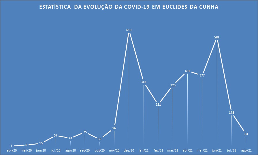 De acordo com o boletim da Secretaria Municipal da Saúde, em agosto, Euclides da Cunha registrou 64 novos casos, com média diária de 2,06. O boletim mais recente mostra o município com 3.440 casos registrados, com 3.361 pacientes recuperados e 47 óbitos. Restam ainda 32 casos ativos.