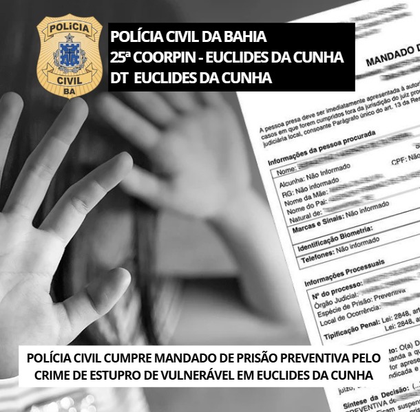 A Polícia Civil do Estado da Bahia, por meio da 25ª Coordenadoria Regional de Polícia do Interior (25ª COORPIN) e da Delegacia Territorial de Euclides da Cunha, cumpriu nesta segunda-feira (5) um mandado de prisão preventiva contra um homem de 61 anos, identificado pelas iniciais E.J.S., pelo crime de estupro de vulnerável.