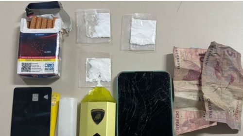 Durante a busca pessoal, os policiais encontraram papelotes contendo substância análoga à cocaína, além de outros objetos. O indivíduo detido, juntamente com todo o material apreendido, foi encaminhado à Delegacia de Polícia Civil, onde foram adotadas as medidas legais cabíveis.