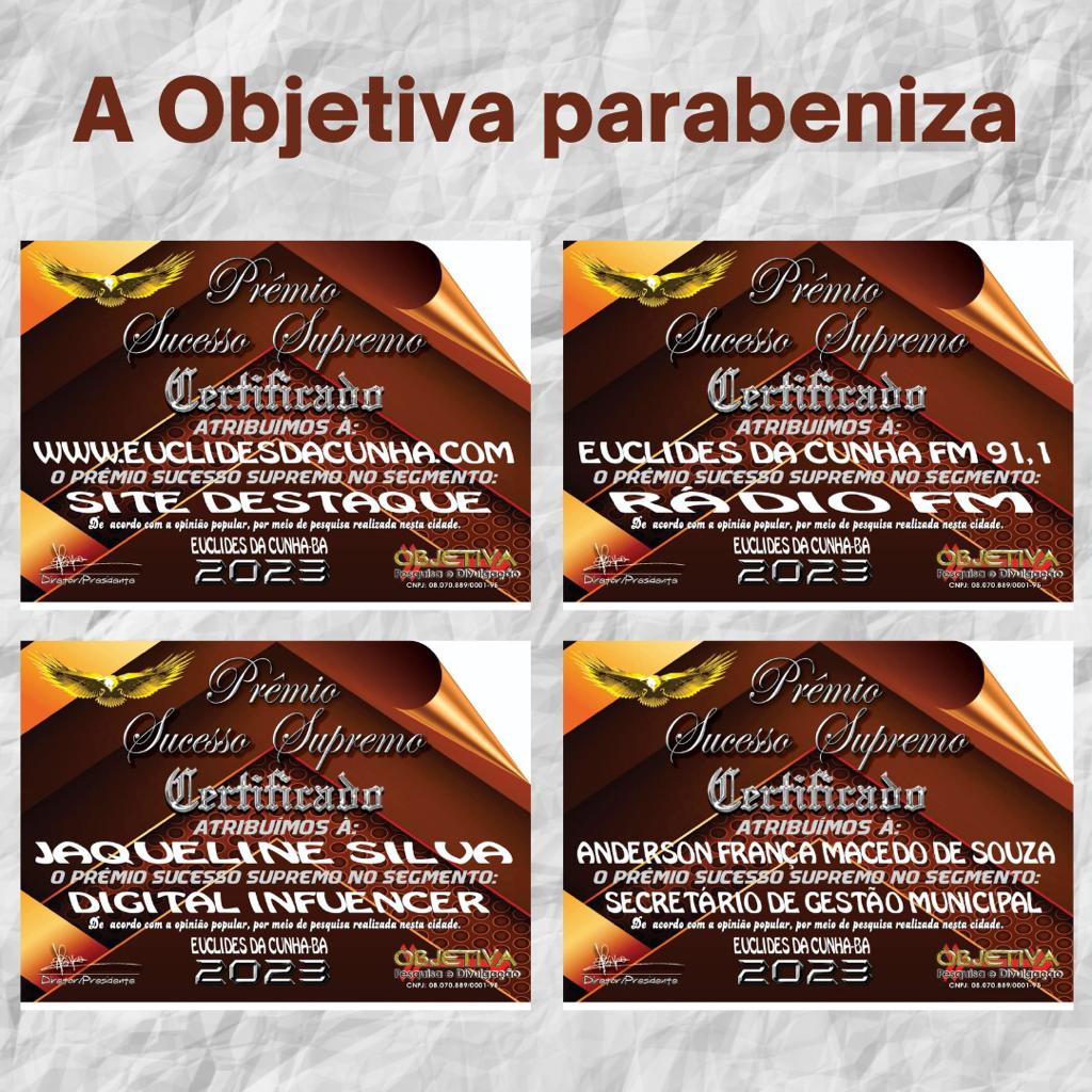 O Prêmio Sucesso Supremo 2023 é realizado pela empresa Objetiva Pesquisa está a exatamente 16 anos no mercado em Euclides da Cunha – BA, fazendo manuseio de dados da satisfação do público com os serviços prestados por empresas locais, para eleger profissionais e empresas de destaque.