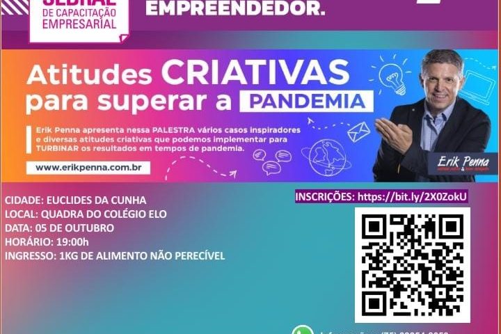 Ver mais Semana Sebrae de Capacitação Empresarial traz para Euclides da Cunha o palestrante Erik PennaSemana SEBRAE Atitudes Criativas Para Superar a Pandemia – Erik Penna